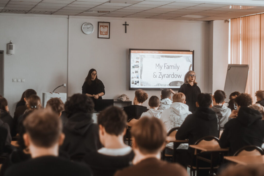 W poniedziałek 9 lutego w naszym liceum odbyło się spotkanie zorganizowane przez Panią Bożenę Gąsiorowską w ramach projektu Pamięć nie wyklucza 2026. Naszym gościem była Elena Cuomo z Argentyny, potomkini Żyrardowskich Żydów. Przybliżyła ona naszym uczniom historię swojej rodziny, którą unicestwiła Zagłada. Po spotkaniu młodzież naszej szkoły udała się do Macewy Pamięci, gdzie odbył się Apel Pamięci, złożono tam kwiaty i symboliczne kamienie. Ten czas był czasem zadumy w 85. rocznicę likwidacji getta w Żyrardowie i zagłady trzech tysięcy mieszkańców naszego miasta.