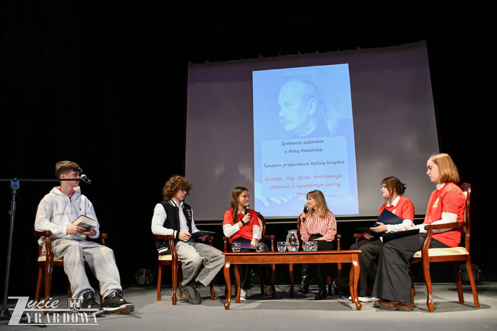 W drugiej części spotkanie miało charakter spotkania autorskiego- czworo uczniów klasy ID poprowadziło z Autorką bardzo ciekawą rozmowę, w której pytali między innymi o inspiracje, pracę nad książką i bohatera biografii – Marka Kotańskiego. W jej trakcie widzowie wysłuchali również fragmentów książki.