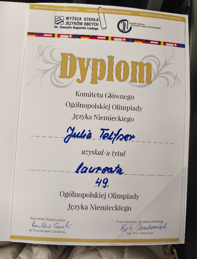 Nasza uczennica z klasy 4e, Julia Telfser, została Laureatką 49. Ogólnopolskiej Olimpiady Języka Niemieckiego. W dniach 27-29 marca 2026 r. w Poznaniu odbył się finał olimpiady- egzamin pisemny i ustny. Przystąpiły do tego etapu 63 osoby z całej Polski. Julia zajęła 2 miejsce wśród 21 Laureatów Olimpiady.