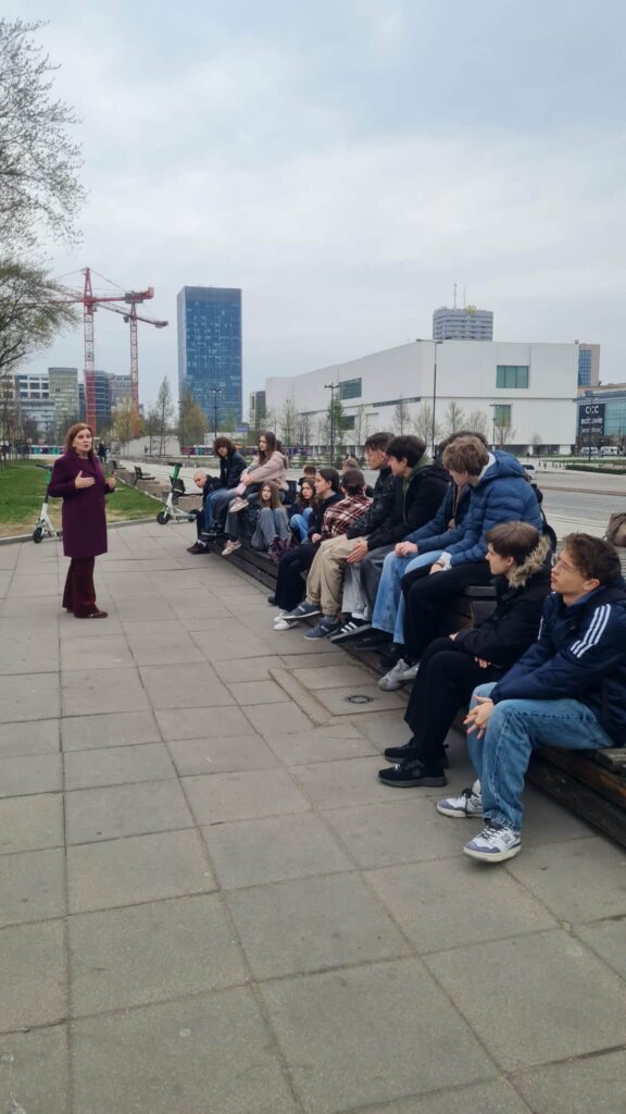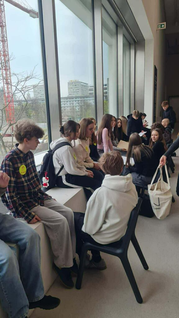 Na początku udaliśmy się do centrum miasta, gdzie zatrzymaliśmy się przy Pałacu Kultury i Nauki. Wysłuchaliśmy krótkiego wykładu przeprowadzonego przez prof. Elżbietę Żaboklicką. Dzięki temu mogliśmy lepiej zrozumieć znaczenie tego charakterystycznego budynku oraz jego rolę w dziejach Warszawy. Następnie grupa rozpoczęła zwiedzanie muzeum z przewodniczką, która w przystępny i ciekawy sposób wprowadzała w tematykę prezentowanych prac.